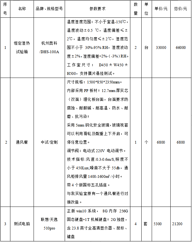 项目名称:量子点应用技术开发实验室恒定湿热试验箱、通风橱、测试电脑采购