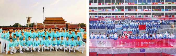左图:参与庆祝中国共产党成立100周年大会合唱团的北航师生在天安门广场合影  右图:在北京2022年冬奥会、冬残奥会中,北航师生志愿者承担服务保障任务